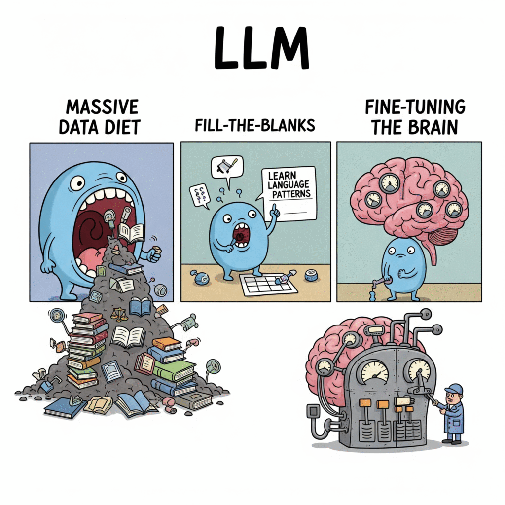 First, the model reads an enormous amount of text. We’re talking about trillions of words from books, websites, articles, and even code. To put this in perspective, imagine reading every book ever written, then reading them thousands of times over. That’s the scale we’re dealing with.