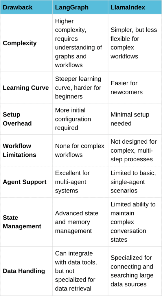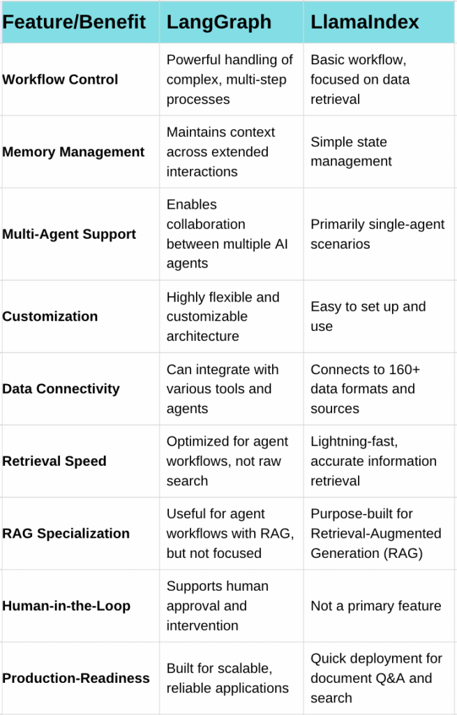 LlamaIndex optimizes for search speed and retrieval accuracy. It’s designed to quickly find the most relevant information from large datasets and deliver it to your AI model. LangGraph focuses on workflow reliability and managing complex interactions between multiple components.