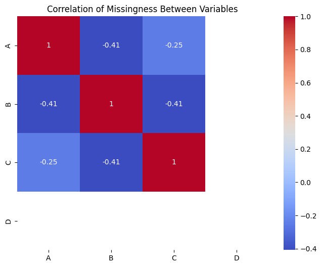 - A matrix of missing values that represents the pattern of missingness in the dataset.