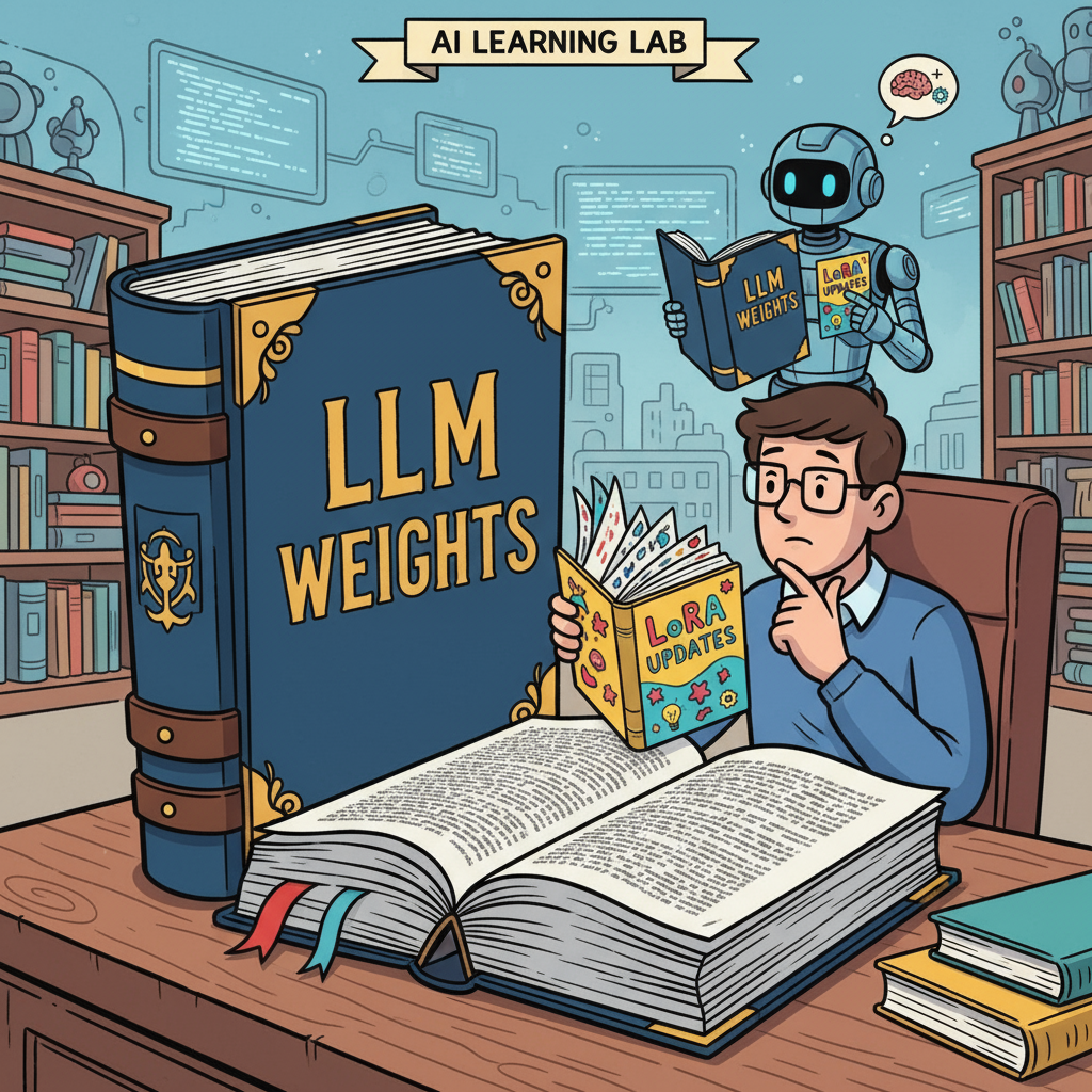 Here’s an analogy that makes this clearer: imagine you’re editing a massive encyclopedia. Instead of rewriting every page, you create a thin supplementary booklet with corrections and additions. When someone reads the encyclopedia, they reference both the original and your supplement to get the updated information. That’s essentially how LoRA works. It creates small “adapter” matrices that modify the model’s behavior without changing the original weights.