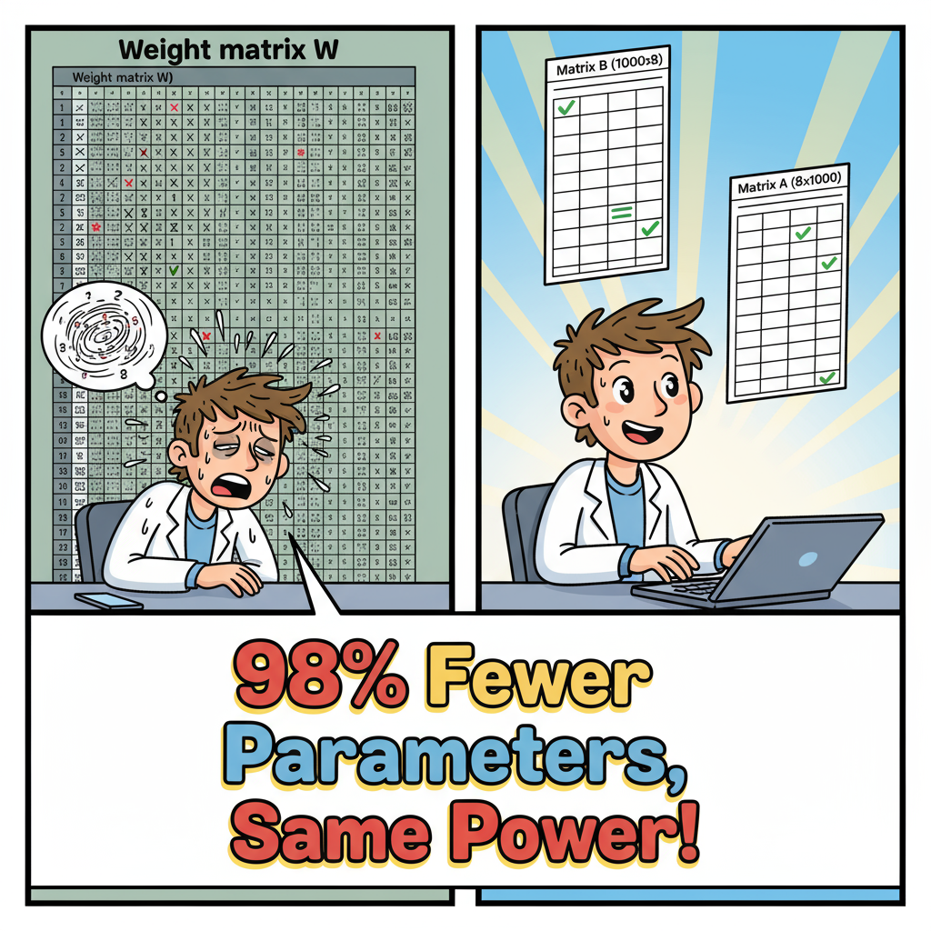 Instead of updating a weight matrix W (which might be 1000×1000 = 1 million parameters), LoRA decomposes the update into two smaller matrices: